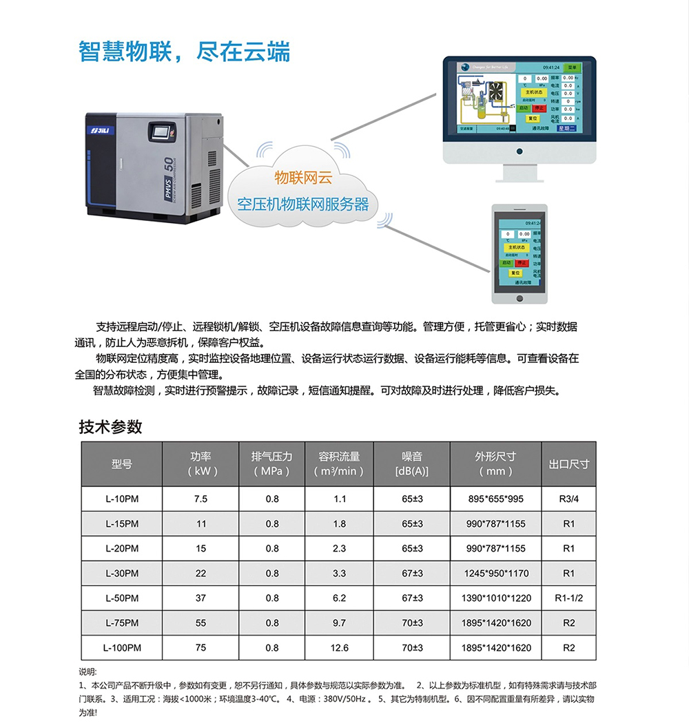支持远程启动/停止、远程锁机/解锁、空压机设备故障信息查询等功能。管理方便,托管更省心;实时数据通讯,防止人为恶意拆机,保障客户权益。 物联网定位精度高,实时监控设备地理位置、设备运行状态运行数据、设备运行能耗等信息。可查看设备在全国的分布状态,方便集中管理。 智慧故障检测,实时进行预警提示,故障记录,短信通知提醒。可对故障及时进行处理,降低客户损失。